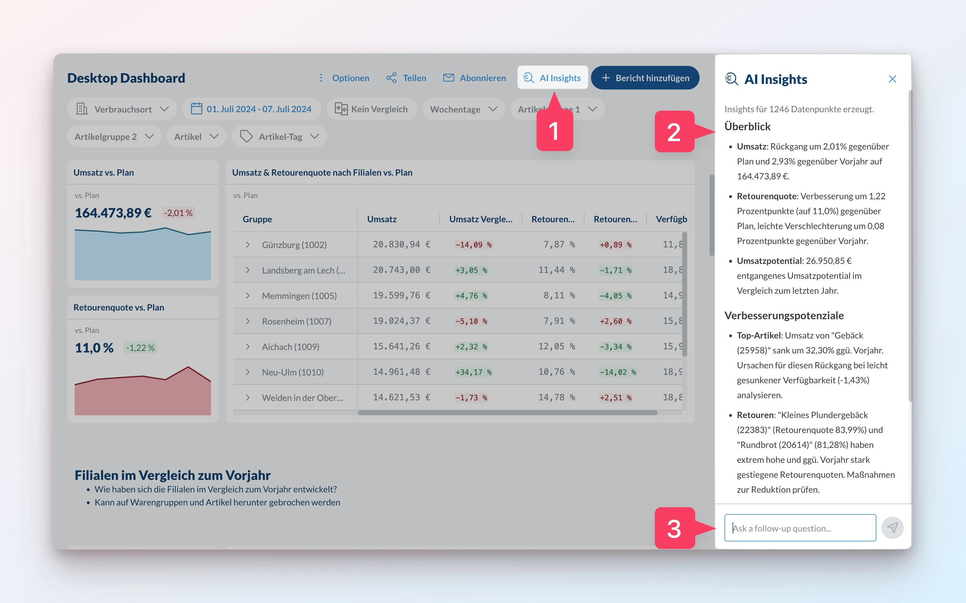 KI-Einblicke oben in deinem Dashboard, um die KI-Chat-Oberfläche zu öffnen.