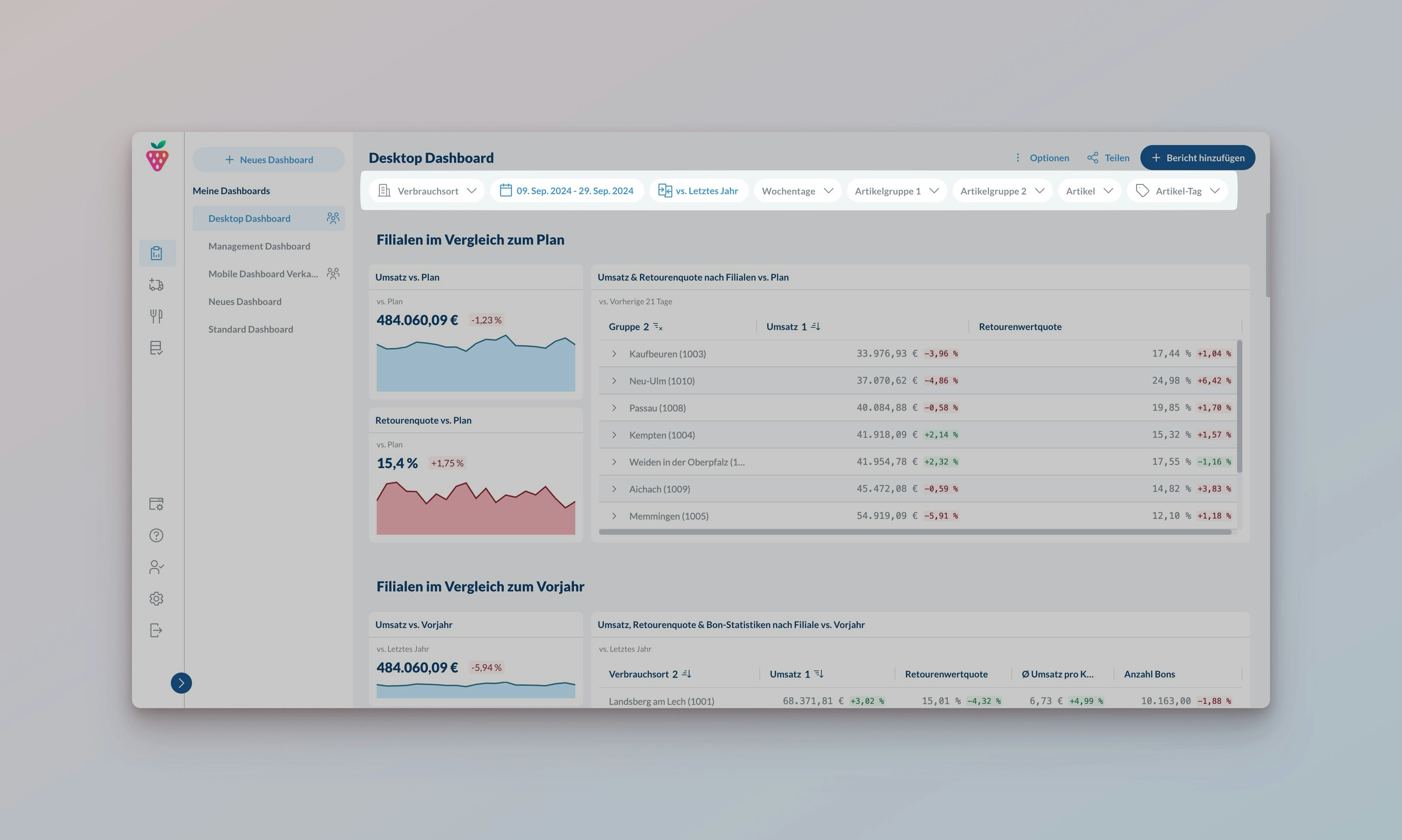 Jedes Dashboard hat oben Filter, die für alle Berichte gelten: