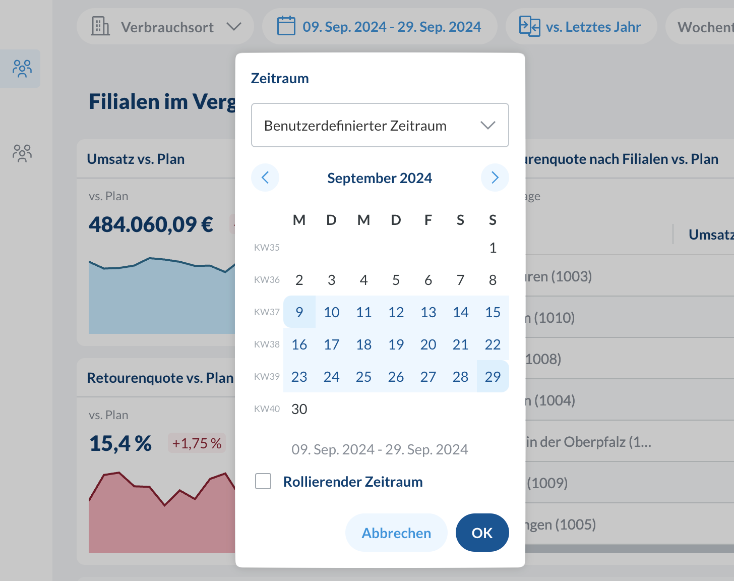 Individueller Zeitraum: Wähle genaue Daten oder rollende Zeiträume, die sich automatisch aktualisierenSchnellauswahl: Springe zu häufigen Zeiträumen wie