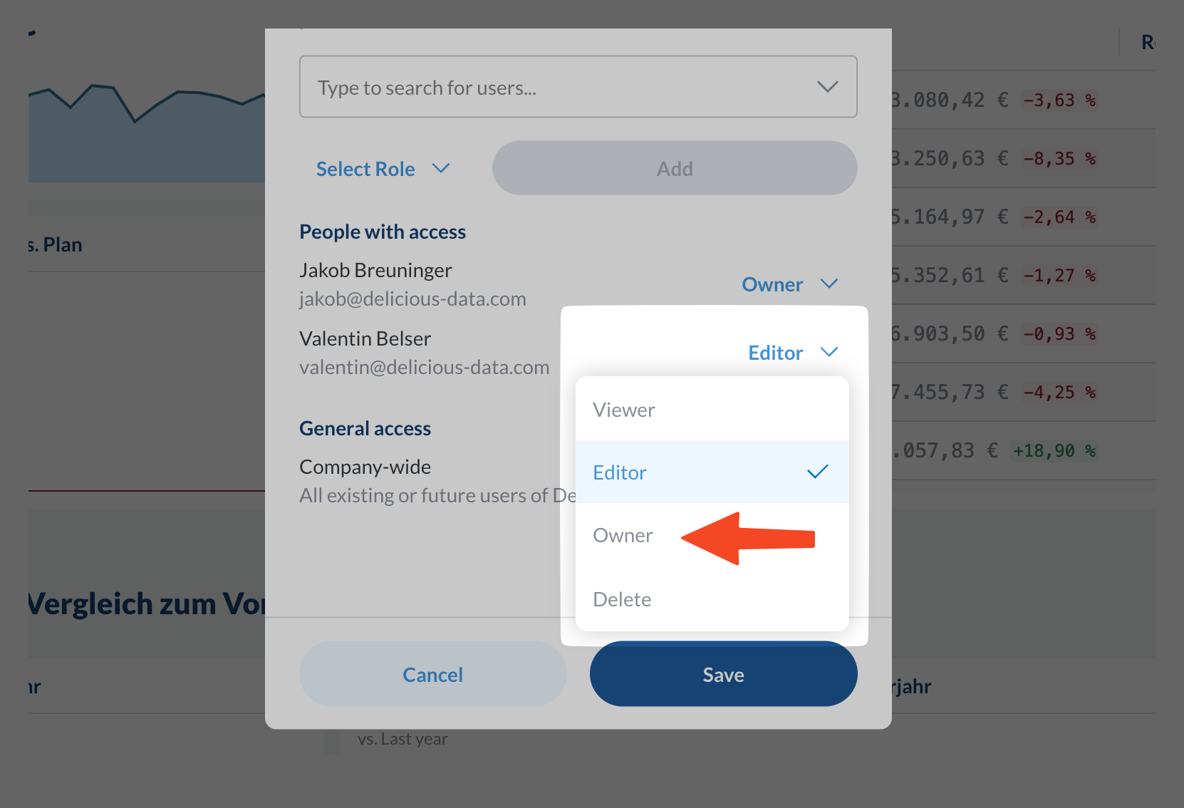 - Bestehende Benutzer: Wähle aus allen Personen mit Dashboard-Zugriff