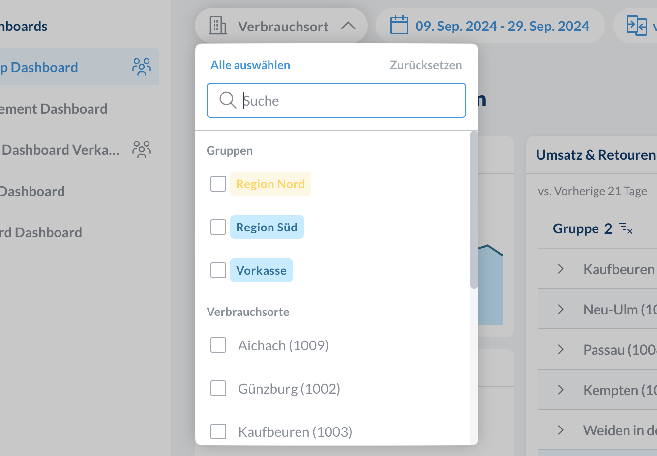 Gruppen: Vordefinierte Verbrauchsortgruppen wie “Region Nord” oder “Region Süd”Verbrauchsorte: Einzelne Filialen für detaillierte Analysen
