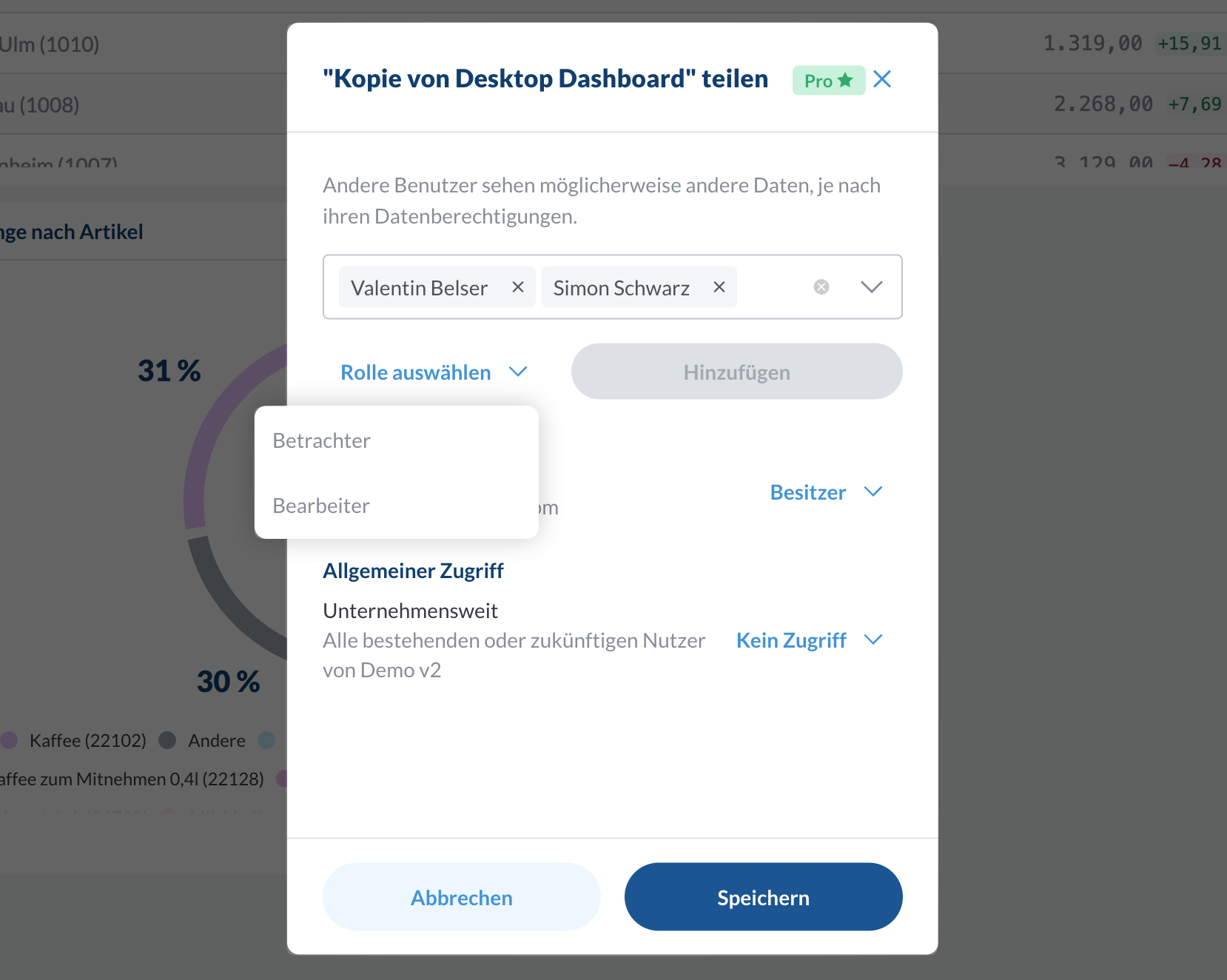 Betrachter, Bearbeiter- Bearbeiter: Können das Dashboard für alle anderen aktualisieren, aber nicht teilen oder löschen.