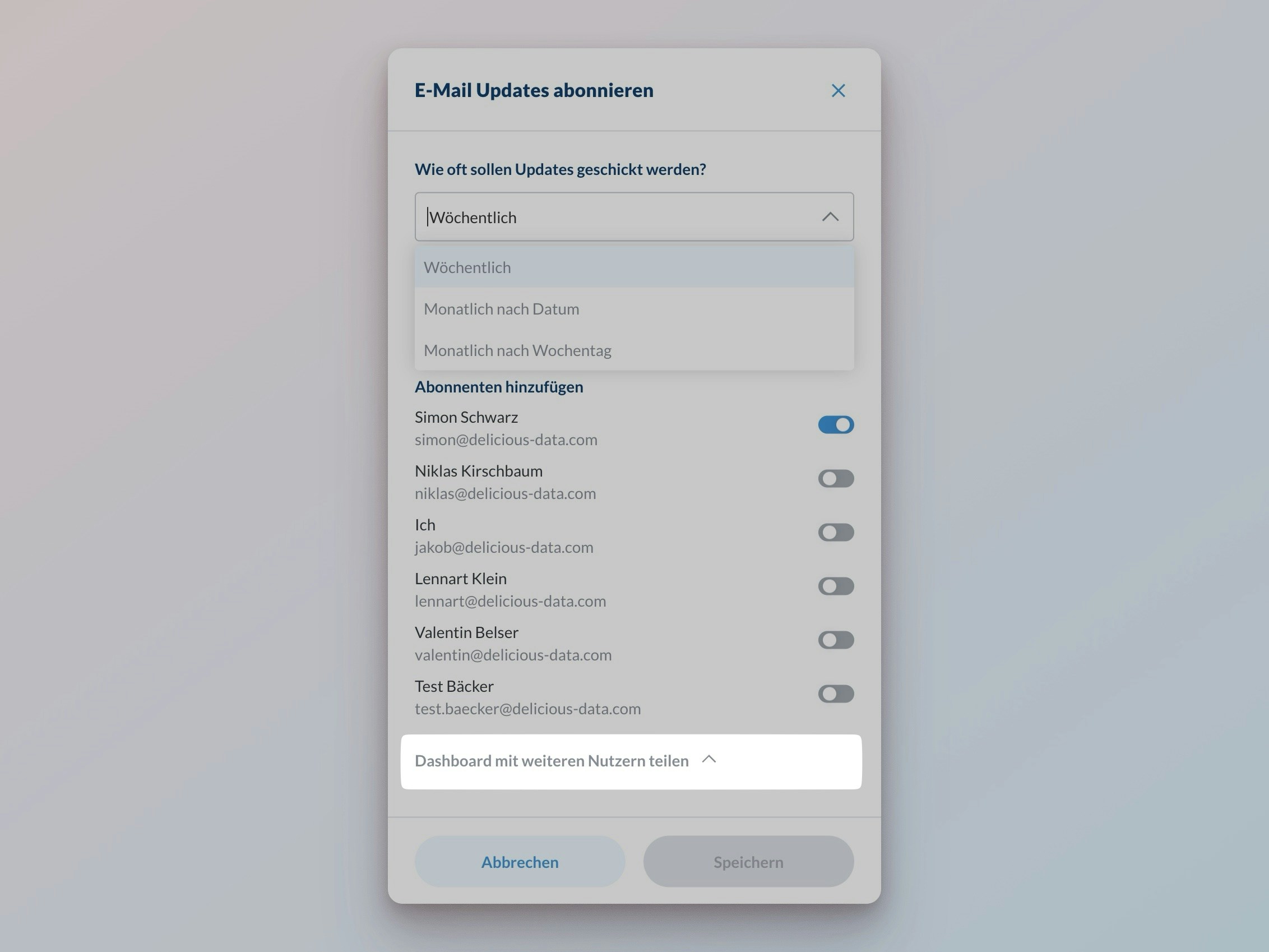 - Neue Empfänger: Gewähre Dashboard-Zugriff direkt im Abonnement-Dialog