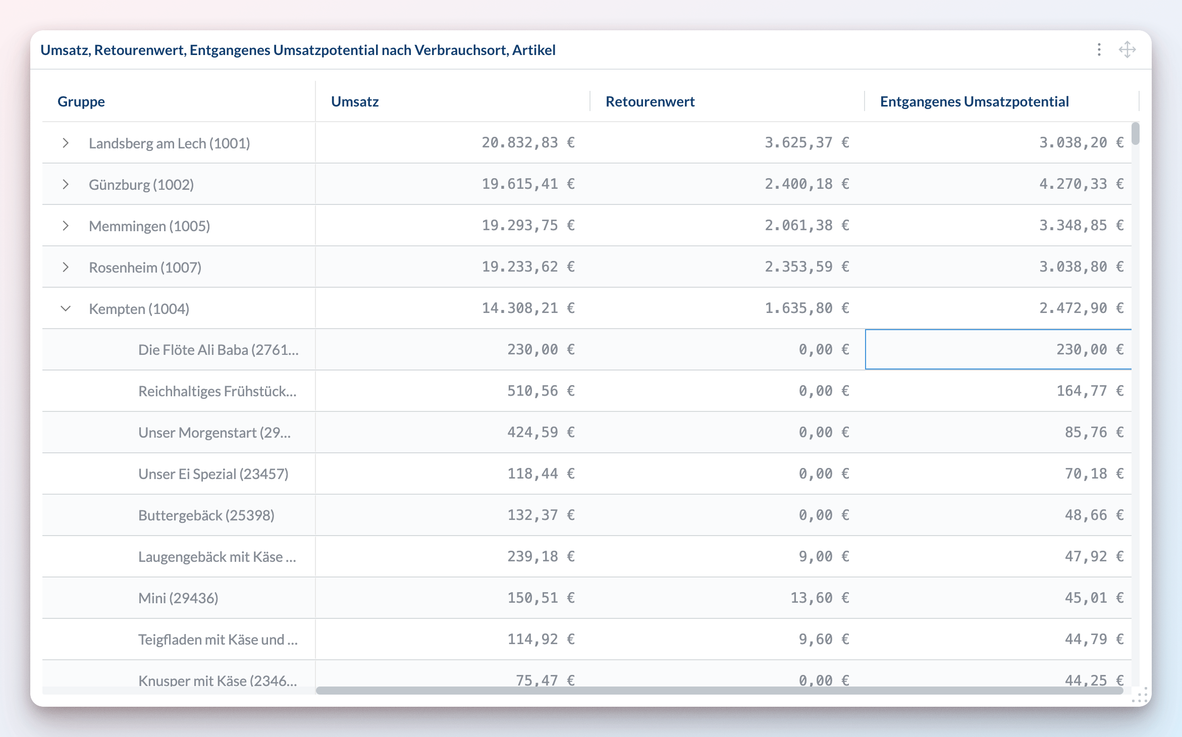 Hier ist ein Beispiel einer Tabelle, die nach Verbrauchsort und Artikel gruppiert ist und Umsatz, Retourenwert und Entgangenes Umsatzpotential für eine ganze Woche vergleicht: