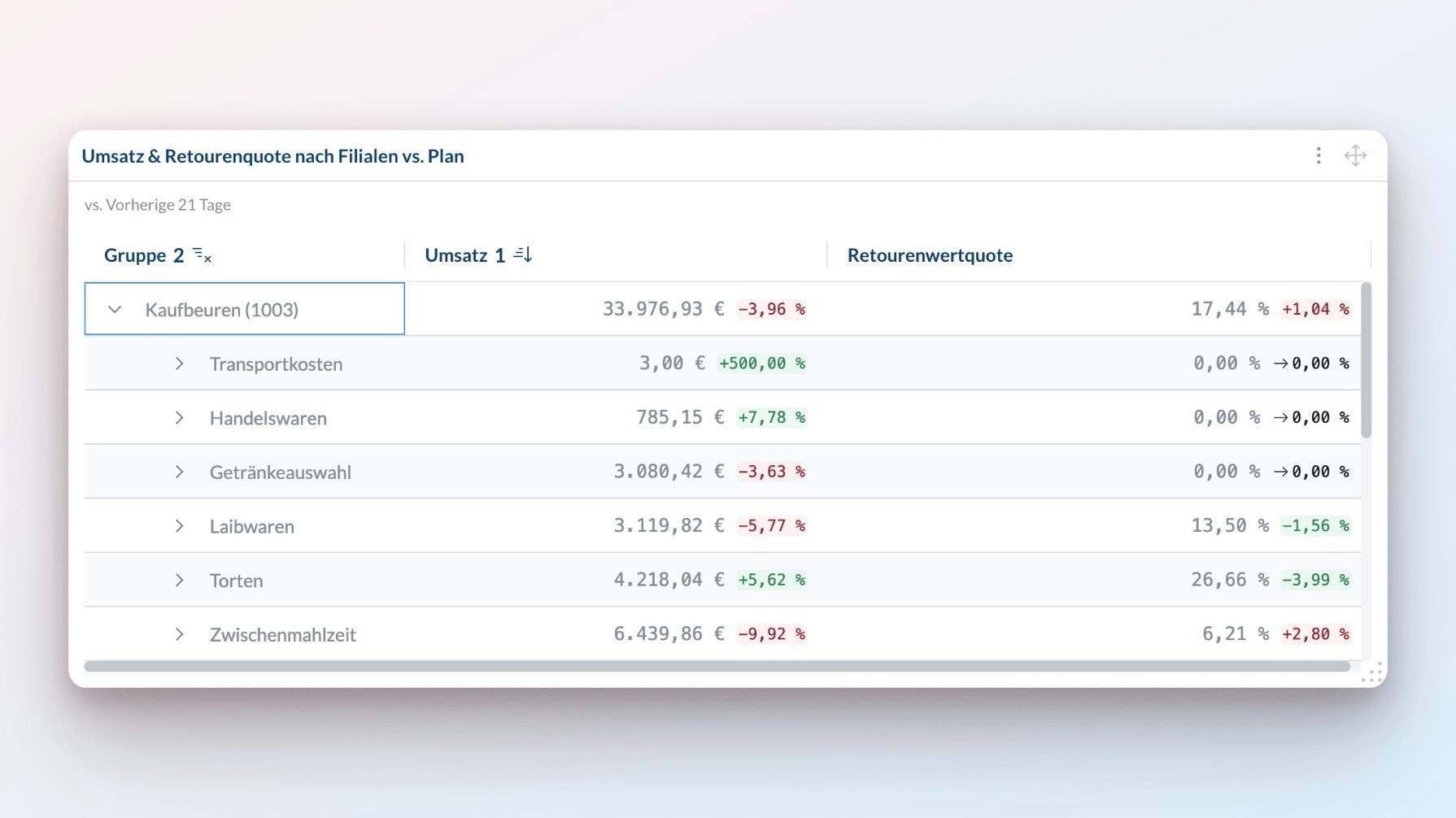 Der Nettofluss hilft dir zu erkennen, ob Filialen die Rezepte korrekt einhalten. Zum Beispiel:- Wenn ein Rezept 100g Kaffee pro Tasse vorschreibt